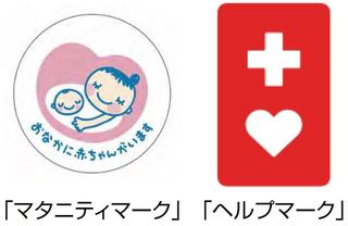 - ●外見から分からなくても援助や配慮を必要としている方が、周囲の方に知らせる「ヘルプマーク」、周囲の方に妊婦であることを示しやすくする「マタニティマーク」などを身につけている場合には、配慮が必要です。